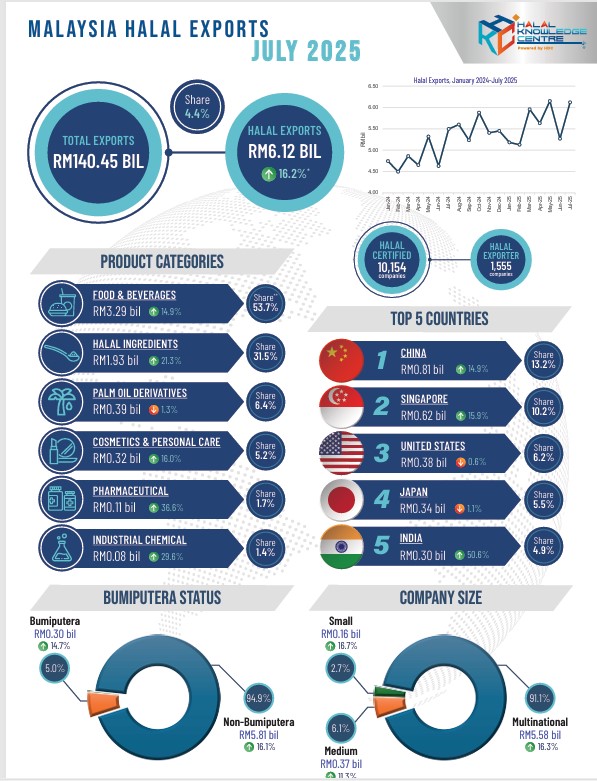 25 Sep, 2025The total export performance for Malaysia in July 2025 amounted to RM140.45 billion and Halal exports reached RM6.12billion, marking a month-on-month increase of 16.2%. The number of halal-certifie...
