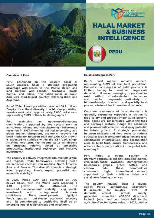 17 Nov, 2025Peru, perched on South America’s Pacific edge, is the continent’s third-largest country with a population of 34.2 million. Malaysia’s halal exports to Peru reached RM 231.34 million in 2024, ...