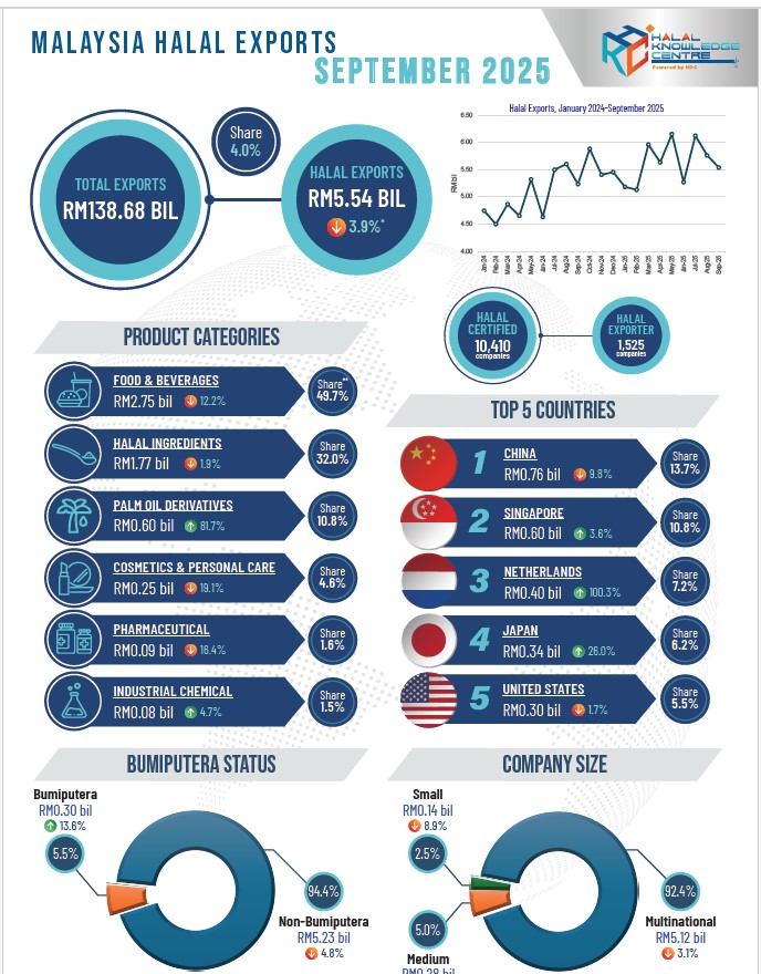 24 Dec, 2025The total export performance for Malaysia in September 2025 amounted to RM138.68 billion and Halal exports reached RM5.54 billion, marking a month-on-month decrease of 3.9%. The number of halal-cer...